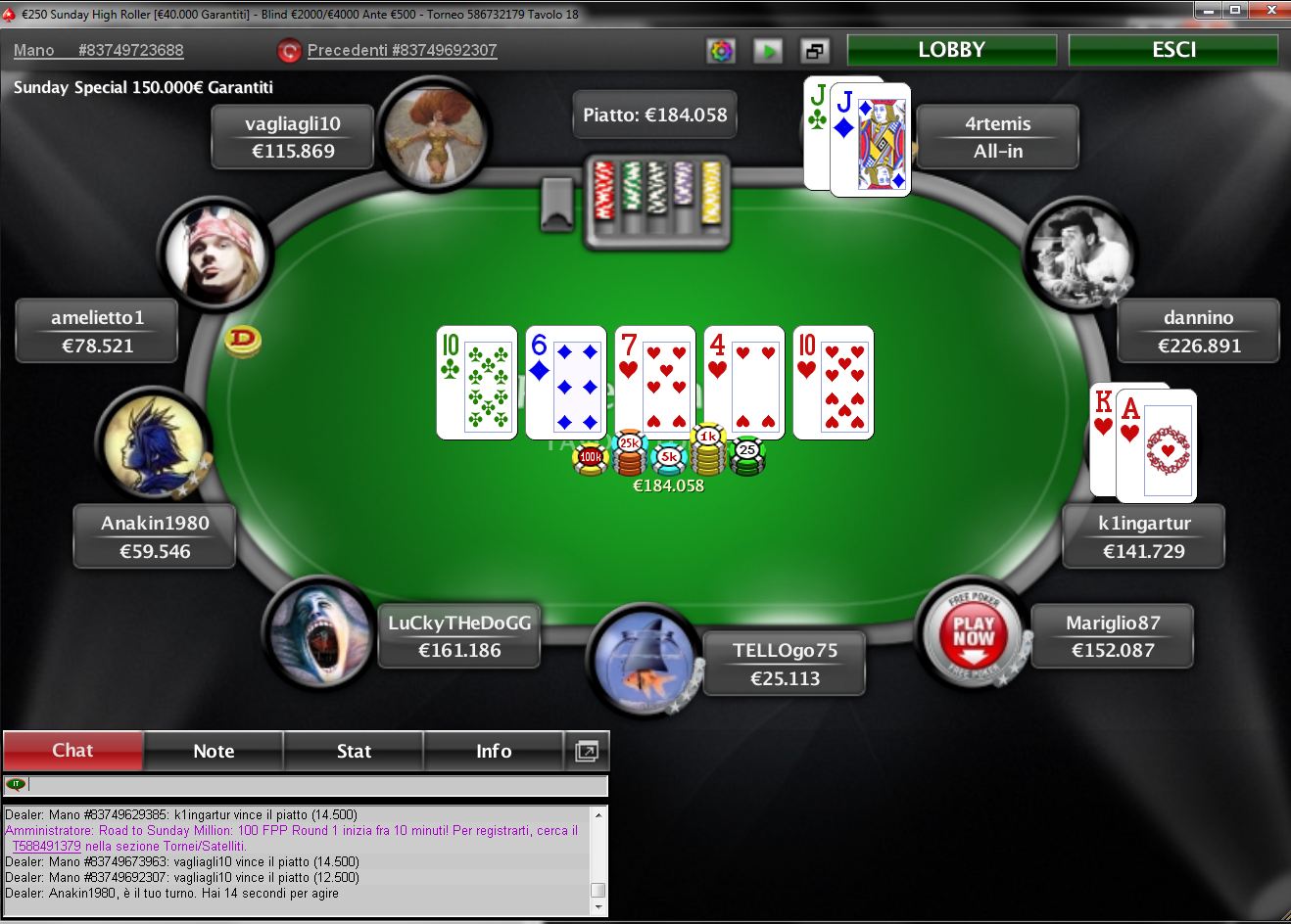 Nell’evento High Roller manca il colpaccio Arturo “k1ingartur” Pierantoni che si è dovuto arrendere soltanto alla fine del testa a testa conclusivo. Il primo posto è andato così a “Mariglio87” che potrà contare su 9.164 euro in più nel proprio bankroll.