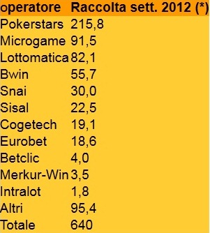 In contrazione, invece, tutti gli altri concessionari: più distanziati seguono Microgame (91,5 milioni di raccolta) e Lottomatica (82,1 milioni di raccolta).