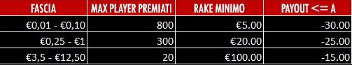 3ª Fascia: 3.5€ – 12.5€ – Rake generato nel mese maggiore o uguale a 100€ e Payout minore o uguale al -15% (es.: -Il player ha giocato 100€ e ne ha vinti 85€, bilancio -15%)
