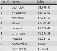 Nell’ evento Sunday High Stakes si sono presentati 123 players, ma alla fine si è imposto “cedhubik” per un payout di poco inferiore ai 6.700 euro.