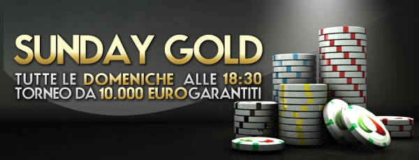 Tutte le domeniche appuntamento imperdibile su Italypoker. Alle ore 18.30 si gioca il fantastico torneo Sunday Gold da 10 mila euro garantiti con un buy-in di 50 euro. Un’opportunità unica per tutti i nostri players di poter giocare per un montepremi fantastico e vincere ricchissimi premi.