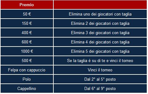 Oltre ai 1.000 € GTD il torneo avrà altre particolarità: innanzitutto tra gli iscritti saranno scelti casualmente cinque giocatori sui quali sarà messa una “taglia” (Bounty), ovvero un premio di 50 € per chi eliminerà dal torneo uno di essi. Premi ancora maggiori aspettano chi riuscirà ad eliminare più di uno dei cinque “ricercati”! Inoltre NetBet mette a disposizione numerosi gadget, brandizzati dalla poker room stessa, per chi riuscirà a raggiungere il Final Table. Ecco una tabella riassuntiva di tutti i bonus offerti nel Torneo di Natale:
