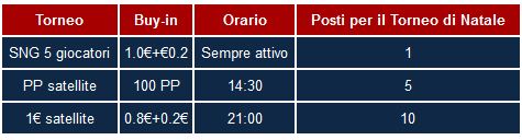 Il torneo avrà un buy-in di soli 5 €, ed inoltre saranno a disposizione dei grinders numerosi satelliti per poter partecipare con una spesa minima. Da Lunedì 12 Dicembre, tutti i giorni su NetBet potrete trovare i seguenti Satelliti per il Torneo di Natale: