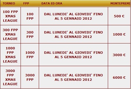 La XMAS LEAGUE mette in palio su PokerClub 53.000 euro: i tornei di riferimento in FPP si giocheranno tutti i lunedì nell’arco di durata della promozione, ad eccezione dell’ultima giornata dedicata agli FPP che sarà domenica 8 gennaio.