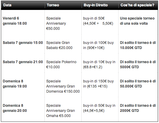 Ecco una tabella riassuntiva dei cinque appuntamenti Speciali Anniversario su Titanbet: