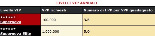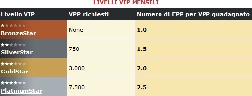 Tutti gli iscritti partono da un livello base “Bronze Star”. Accumulando punti VPP ogni mese si può scalare di livello divenedo: