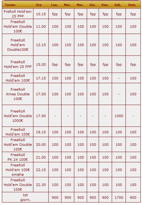Questo è il piano riassuntivo di tutti gli appuntamenti Freeroll su Poker Club, per divertirsi con il poker gratuito!