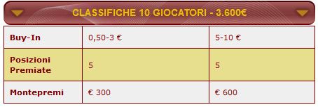 Le classifiche avranno durata settimanale, saranno aggiornate in tempo reale e i bonus verranno accreditati nelle 48 ore successive dal termine delle classifiche stesse.