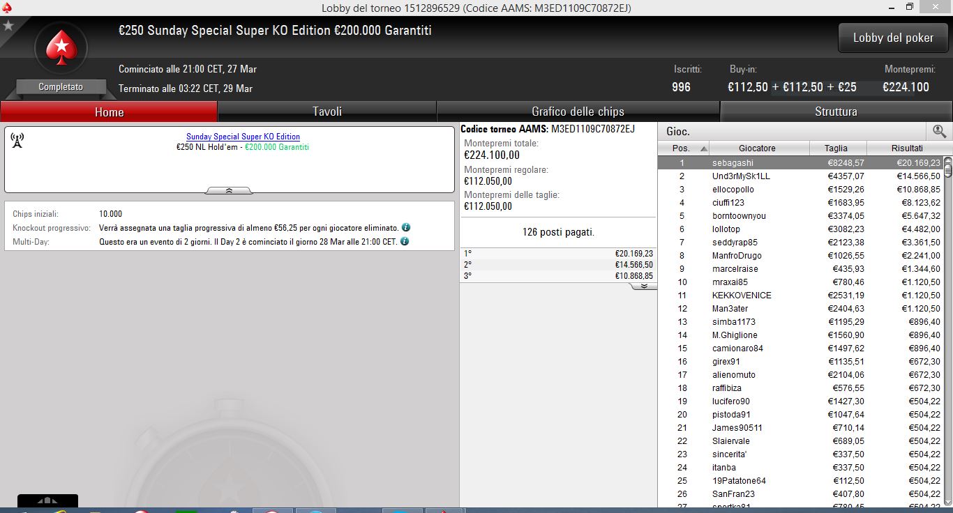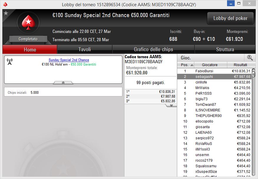 “Lo Special lo avevo vinto già nel 2014, così come altri tornei minori – ci racconta raggiante Sebastian – ultimamente comunque mi sono sbloccato con la vittoria del ‘The Bigger’ da 250€ del 17 febbraio, risultato cui sono seguiti altri buoni piazzamenti. Per quanto riguarda ieri sera, potrei dire che è stato un torneo difficilissimo, però arrivati a un certo punto ragiono un po’ a modo mio, ovvero non guardo in faccia a nessuno. Ho troppa fame, lei prevale su tutto e credo anche per questo le cose siano andate nel verso giusto…”.