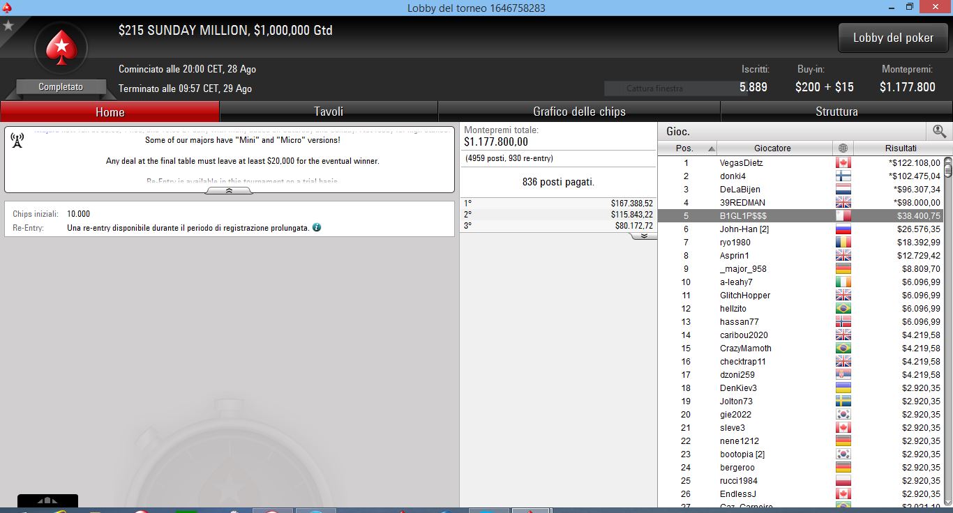 Francesco ha chiuso al quinto posto il Sunday Million da 215 dollari di buy-in, ottenendo così un premio di $38.000 che sposta non poco.