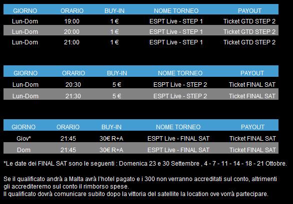 Per questo speciale “ESPT Warm-Up” ci può qualificare anche con solo 1€ tramite i tanti satelliti di BetPro.it! Ecco la programmazione che potete già trovare attiva online su BetPro.it (se non siete già iscritti non vi resta che farlo tramite i nostri Banner di BetPro.it).