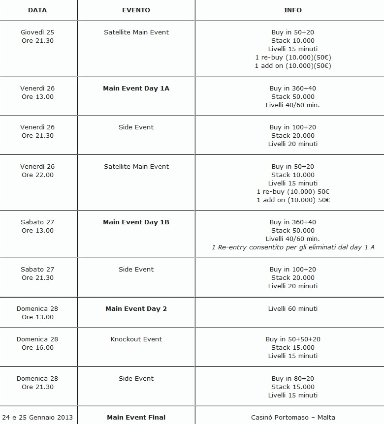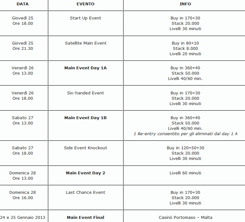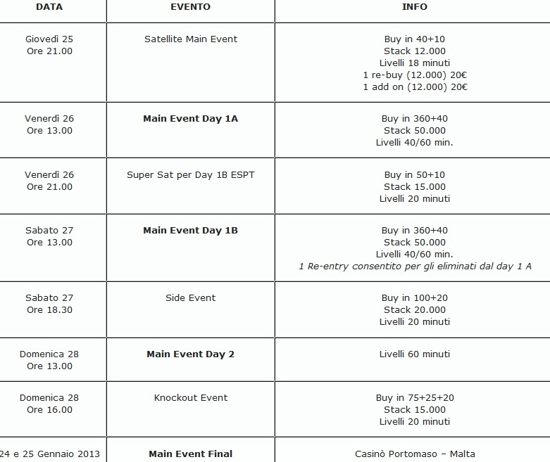 Per la fase finale, invece, ci si da appuntamento al 24 e 25 gennaio dove tutti i giocatori sopravvissuti nei tre casinò si ritroveranno a Malta per disputare il Main Event Final, ovvero day 3 e final table.