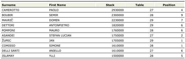 Poi ovviamente si è scatenato il delirio con dieci giocatori out nel giro di poche mani, probabilmente con più voglia di andare a letto che di provarci ancora con uno stack minuscolo. In testa ai 26 giocatori rimasti troviamo Paolo Camerotto con quasi tre milioni di fiches, ben 600.000 in più dei suoi inseguitori, Semir Boubir e Domen Mavric. Chiude il Top10 del chipcount un cognome molto conosciuto per i grinder dell’online: Islamay. In questo caso non si tratta del famoso Erion ma di suo padre Ylli.