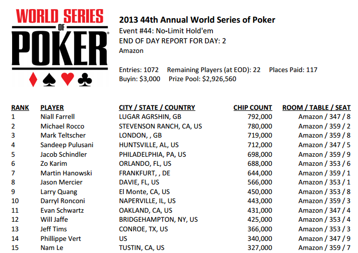 “Galb” rimane dunque fuori della lotta per un braccialetto molto ricco, 592.684$. Rimane invece dentro, non solo a caccia del braccialetto ma di una certa scommessa di cui vi abbiamo già parlato, Jason Mercier, ottavo nel chipcount e concentrato per shippare questo Evento 44. Ecco i primi 15 dei 22 giocatori rimasti: