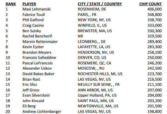 Per l’esattezza, Galfond ha chiuso terzo nel chipcount. Il torneo riparte domani con 101 players left e 18 itm, bui 800-1.600 ante 200.