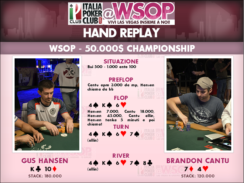 Il flop è di quelli particolari, che apre parecchi progetti: K di picche, 4 di picche, 6 di cuori. Hansen e Cantu a questo punto scatenano l’inferno. Hansen va in donkbet per 7.000 su un piatto di 8.300. Cantu non ci sta e rilancia a 18.000 solo per veders arrivare la threebet del danese a 45.000. Cantu non ci pensa molto per spingere in mezzo il resto del suo stack, circa 100.000 fiches.