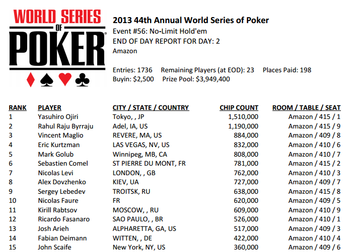 Un peccato che nessuno di loro possa andare al Day3 dove il field iniziale di 1.736 giocatori si è ridotto a soli 23. A uno di loro andrà il braccialetto di 730.756$ ma 9 di loro giocheranno un Final Table con più di due milioni di dollari in palio. Ecco i primi quindici del chipcount: