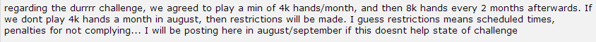 I due player high-stakes si sarebbero privatamente accordati per giocare almeno 4 mila mani al mese a partire da Agosto, per poi proseguire con 8 mila mani ogni due mesi. Qualora non venissero rispettati gli accordi, scatterebbero delle “penalità”, ancora però non specificate in modo trasparente da “Jungleman12”.
