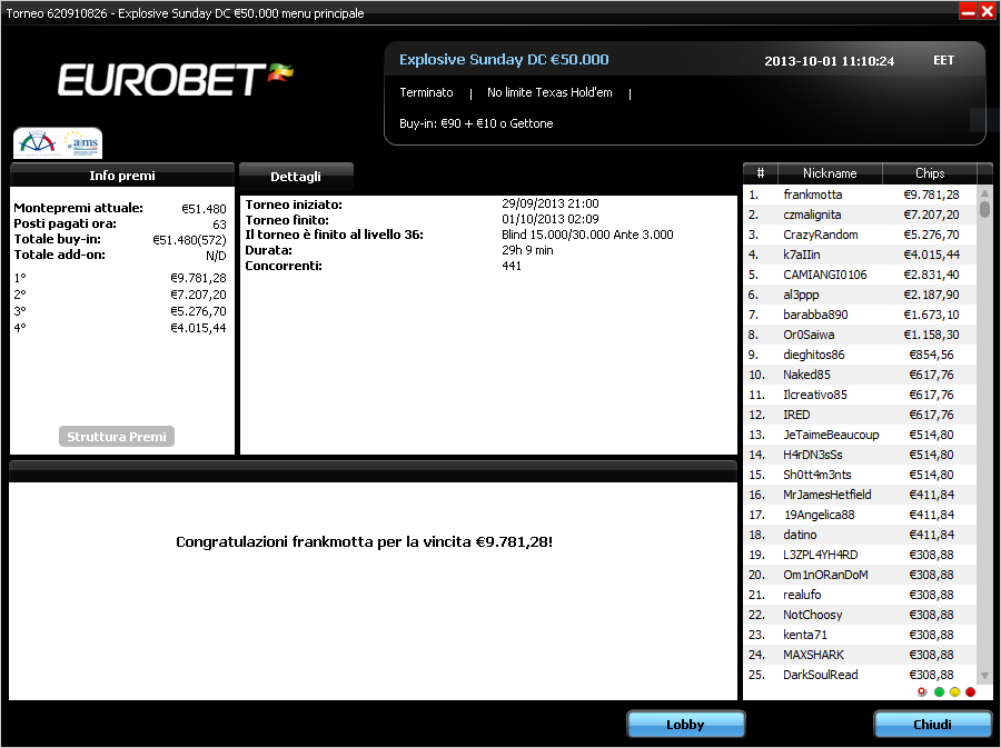 Finito anche il Day2 di uno dei domenicali più ricchi e affollati delle room .it: l’Explosive Sunday di iPoker (Eurobet, Titanbet, NetBet, Sisal, Betclic). Un Explosive che questo weekend è arrivato ai 51.480€ di montepremi, superando il garantito. A vincere è stato “frankmotta”, che si porta a casa i 9.781,28€ del primo premio.