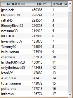 In testa al chipcount troviamo “jpsblack”, che ha demolito i tavoli accumulando uno stack imponente di oltre 450.000 fiches. L’ultimo ad aver fatto uno stack simile è stato “NoFear11”, che alla fine ha vinto il torneo poche settimane fa. Sarà “jpsblack” di emularlo? Vedremo, perché dietro di lui vengono alcuni giocatori che senza avere il suo stack immaginiamo abbiano forse un po’ più di esperienza nell’online.