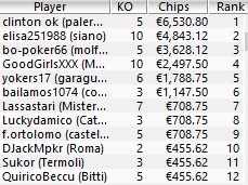 Uno dei format più originali di questo ICOOP: un torneo di una variante come l’Omaha, turbo e addirittura knock-out. Una struttura che ha convinto 450 giocatori che hanno messo una taglia di 15€ sulle proprie teste e si sono scontrati finché il palermitano “clinton ok” non si è aggiudicato la vittoria, il braccialetto e i 6.530,80 €. Ecco il payout degli ultimi due tavoli e il numero di taglie accumulate.