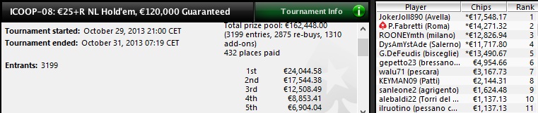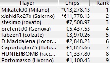 Uno dei tornei turbo dell’ICOOP, uno dei pochi eventi in cui il braccialetto si risolve in questioni di ore. A vincere è “Mikatek90” di Milano, che porta a casa 13.278,13€ dopo il deal con il secondo, Alessandro “xJaNdRo27x” Sarro di Salerno, che incassa ne 11.778,13€. L’unico pro di casa ad aver raggiunto l’in the money è Alessandro “nektarine16” Di Michele, 125° per 172,62€. Ecco il payout del Final Table: