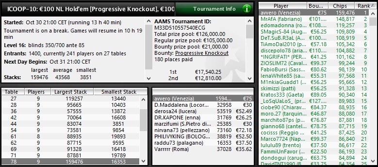 Uno dei format più originali di questo ICOOP, il “Progressive Knockout”, ovvero un torneo in cui quando un giocatore elimina un avversario incassa una parte della sua taglia con l’altra che viene aggiunta alla propria. Per esempio, su 10€ di taglia, 7,5€ si incassano subito e 2,5€ si aggiungono alla propria.