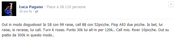 Eliminazione, invece, estremamente ‘sick’ per Luca Pagano, in una mano che lo avrebbe portato oltre le 300.000 chips. Ha ‘urlato’ il suo disappunto via Facebook, spiegando la mano ‘maledetta’: