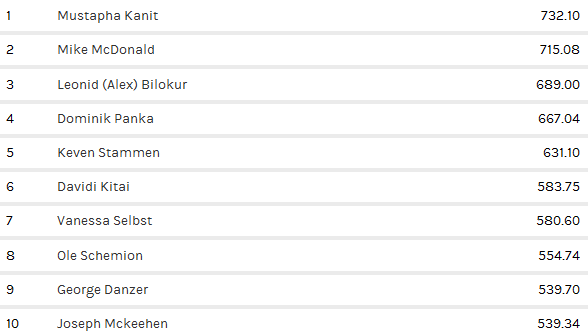 Con i suoi attuali 732.10 punti, sopravanza due mostri sacri del circuito live, ovvero il canadese Mike ‘Timex’ McDonald (715.08) e il russo Alex Bilokur (689).