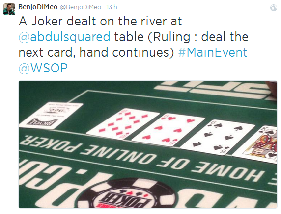 Questa notte, dunque, è stato postata su Twitter dal giornalista francese Benjo Di Meo una foto emblematica, che mostra un board, o meglio un river, piuttosto insolito su uno dei tavoli del Main Event in corso di svolgimento: una ‘blank’ totale, dato che l’ultima carta girata dal dealer è stata… un Jolly! Secondo accadimento da ‘wow!’, in cui nessuno ha troppe colpe, successo nell’estate di Las Vegas ai tavoli delle WSOP.