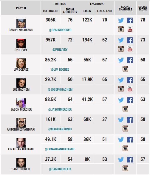 Stando ai risultati determinati utilizzando ‘Followerwonk’ (determina analiticamente l’influenza di un dato profilo su Twitter) e ‘LikeAlyzer’ (lavora come ‘Followerwonk’ ma per Facebook), il leader della speciale classifica è risultato essere il pro di PokerStars Daniel Negreanu, che proprio in questi giorni ha fatto parlare di sé per alcune dichiarazioni sulla crisi mediorientale.
