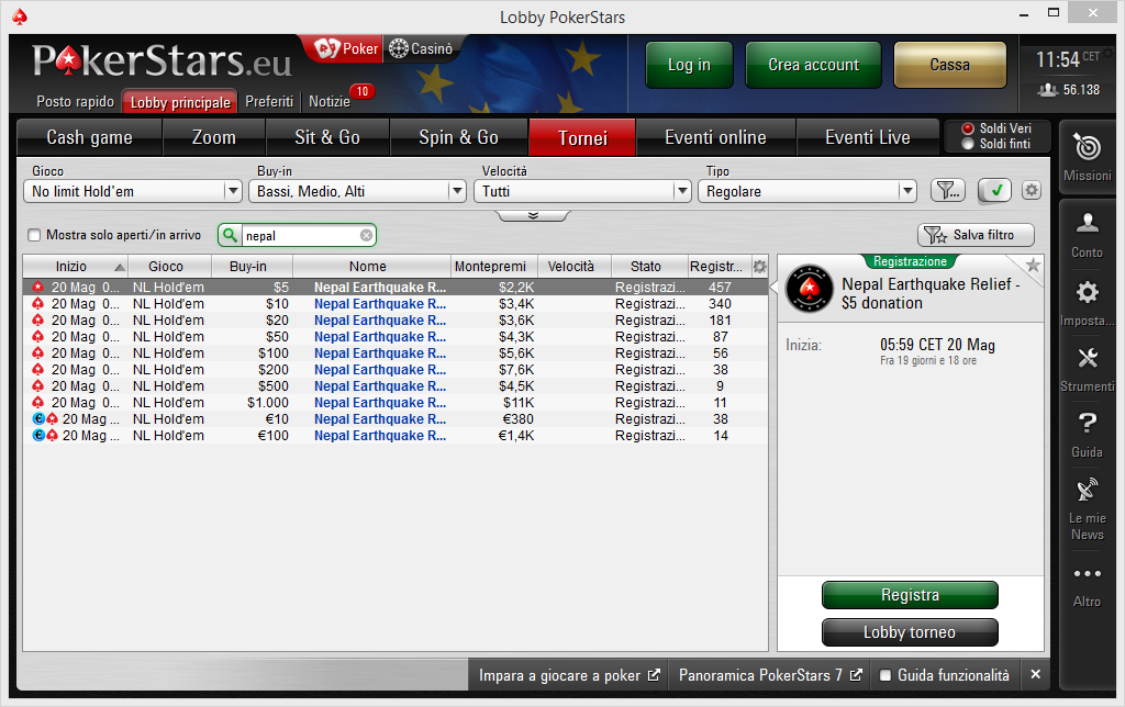 Per effettuare la donazione, che PokerStars si impegna a raddoppiare (se donate 5$ il versamento effettivo sarà di 10$), non vi resta che cercare nella lobby ‘Nepal Earthquake Relief’ e scegliere, poi, quanto dare in beneficenza.