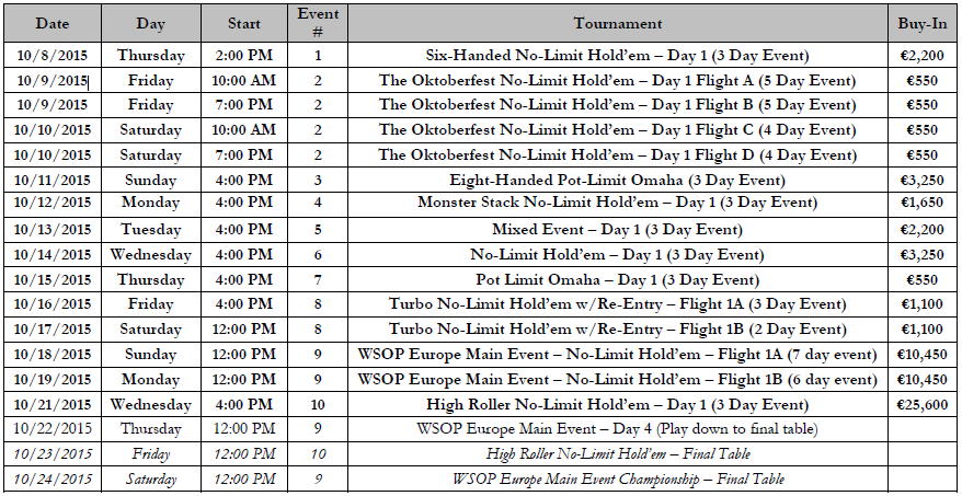 Questo il programma integrale delle WSOPE (Berlino, 8-24 ottobre 2016):