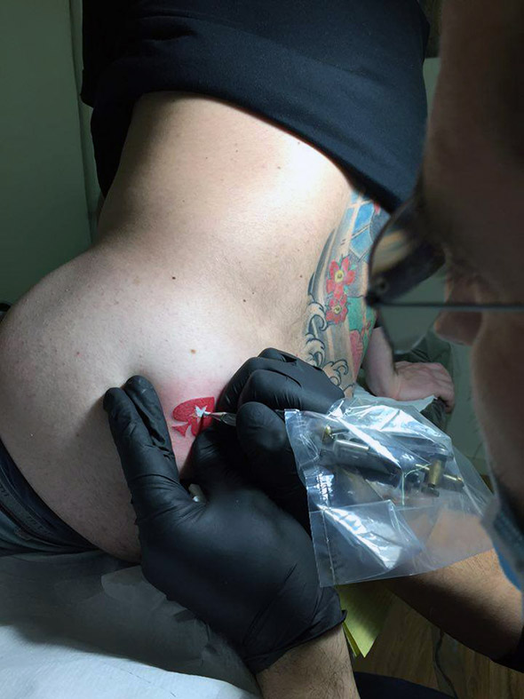 Come vedete nella foto in alto e nelle altre sotto, il ragazzo di Lamezia Terme è stato di parola: adesso una picca rossa si staglia sul suo fondoschiena!