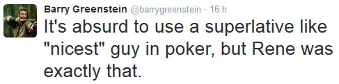 Il povero René vanta anche diversi buoni piazzamenti alle WSOP di Las Vegas, tra cui spicca un 13° posto (14.579$) ottenuto sempre nel 2014 nell’evento #9 della manifestazione, un 1.000$ di no limit hold’em.
