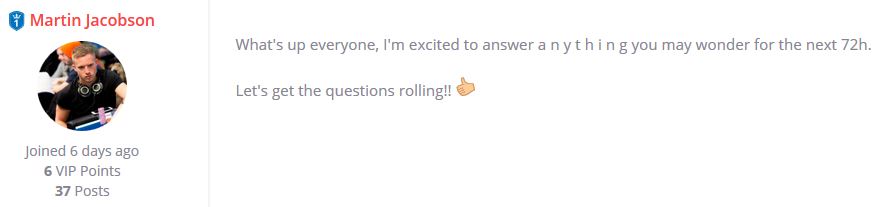 Il campione del mondo svedese, tra l’altro, si è prestato a un interessante ‘gioco’ di pokervip.com, ovvero per 72 ore ogni utente del forum avrebbe potuto domandargli qualsiasi cosa e lui, pazientemente, avrebbe risposto a tutti e… a tutto.