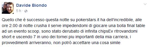 Uno di quelli che ha espresso la propria rabbia sfruttando Facebook è stato Davide ‘Biunnu89’ Biondo, che ha vissuto una nottata da incubo, con il torneo SCOOP che, di fatto, gli è sfuggito da sotto il naso.