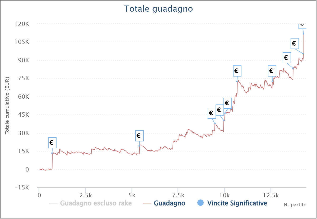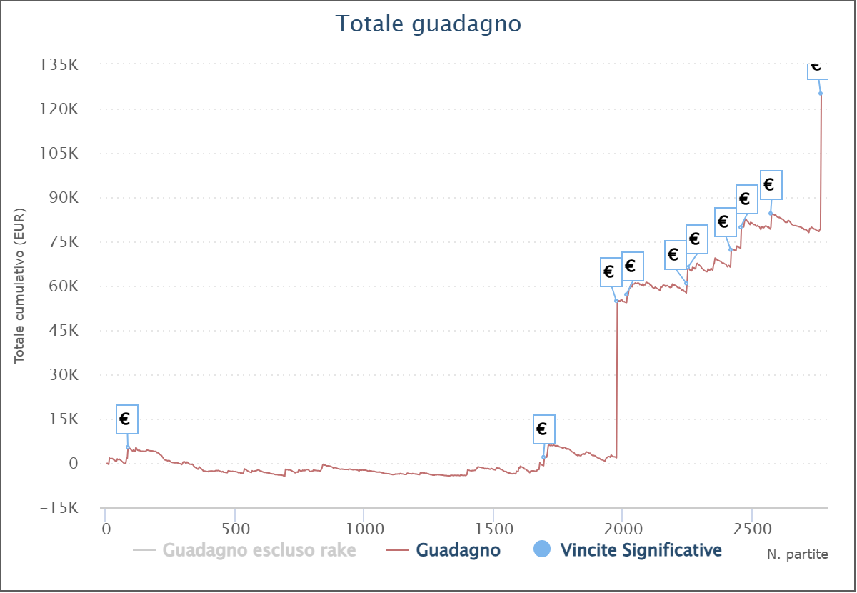 Il vincitore ‘bobooo_92’, per esempio, ha all’attivo 2.766 tornei a buy-in medio 40,71€ per un profitto complessivo di 125.118€! Ovviamente sul bilancio pesa non poco la vittoria di ieri notte, che ha disegnato una simpatica impennata sul grafico del player.