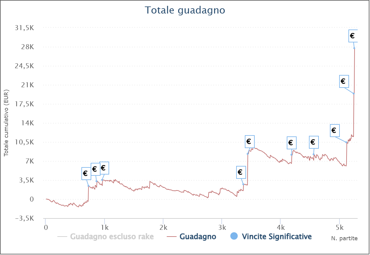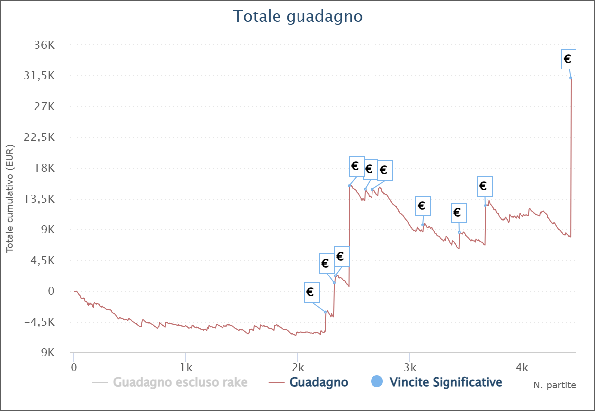 Terminiamo la panoramica con il grafico di ‘Alex_de486’, titolare di 5.256 tornei a buy-in medio 11€ per un profitto di 27.734€.