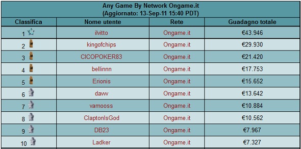 Nulla cambia questa settimana nella top ten di Ongame, solo qualche piccola oscillazione nei profitti. Stabile al comando troviamo ancora “ilvitto” che grazie ad un profit di circa 1.400€ si porta a quota 43.946€. Alle sue spalle troviamo “Kingofchips” che compie un bel salto in avanti con circa 3.500€ di attivo, ottimo risultato anche per “CICOPOKER83” che chiude la settimana con 2.400€ di utile netto.