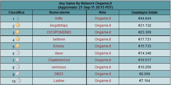 Questa settimana sembra non esserci stato molto traffico ai tavoli SGN del circuito Ongame. Praticamente inalterata la classifica dei profitti, tanto nelle posizioni quanto per i guadagni dei player. Al comando troviamo ancora “ilvitto” seguito a ruota da “Kingofchips” e “CICOPOKER83”.