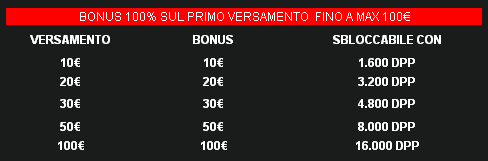 Per sbloccare il tuo bonus e poterlo utilizzare liberamente è necessario accumulare un certo numero di punti, per sapere quanti ne occorrono per sbloccare il bonus poker basta moltiplicare l’importo versato X 160. ES: € 50 (importo versato) X160 = 8.000 DPP.