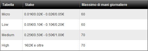 3 – I punti saranno conteggiati secondo il massimo di mani giornaliere consentite, il cui numero troverete nella tabella sottostante.