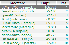 Tra i nomi noti nel chipcount troviamo Dario “dariobonzo” Nittolo, 8° con 47.822 chips.