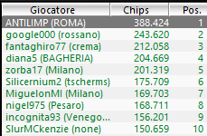 Dopo un Day1 combattuto, in cui si sono giocati 21 livelli, troviamo in testa al chipcount un nome che ha già frequentato i piani alti della lobby di questo torneo: si tratta di “ANTILIMP”, di Roma, che vinse il Sunday Special il 18 Luglio del 2010. Le sue 388.424 chips rappresentano una buona partenza per tentare, stasera, di ripetere il sogno avveratosi un’estate di tre anni fa.