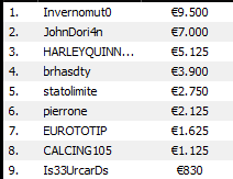 “Invernomut0” ha avuto la meglio su 421 concorrenti e ha battuto in heads up, conclusosi a bui 17.500/35.000 ante 3.500, “JohnDori4n” che, comunque, avrà avuto voglia di festeggiare con i 7.000€ del secondo premio. A completare il podio, per un premio di 5.125€, il giocatore “HARLEYQUINN666”.