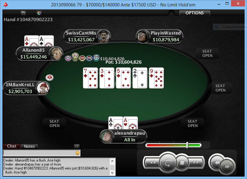 Prima di concludere, vorrei condividere con voi uno showdown che, visto in presa diretta, mi ha lasciato di stucco: immaginate cosa si possa provare alla vista di quel maledetto river? Non so se sia cascato dalla sedia il canadese “alexandrapau”, immagino almeno un annullamento momentaneo della salivazione. Alle WCOOP, insieme alle gioie, ci sono anche dolori sportivi… gustatevi questo…