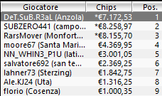 Qualche rammarico per il chipleader di ieri “NN_WHIN3_P1U” che, nonostante abbia iniziato il final day con un cospicuo vantaggio sul secondo in chips, non è riuscito ad andare oltre il 5° posto per 3.001€.