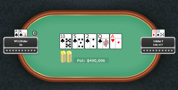 Quando gioca bene e le carte gli arridono sembra davvero non ce ne sia per nessuno. Riesce a non farsi abbattere neanche dopo showdown devastanti tipo il seguente, dove in ballo c’erano “solo” 490,906$: cooler già preflop che, comunque, si concretizza solo al flop quando i due contendenti, evidentemente, non possono che andar rotti.
