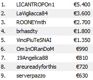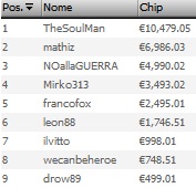 Più lunga è stata la lotta al Deep Sunday Master, con ben 520 giocatori a caccia di un primo premio che alla fine è andato oltre i 10.000€. A finire in cima a tutti è “TheSoulMan”, che ha superato in heads-up “mathiz”, che vince comunque quasi 7.000€. Da sottolineare il sesto posto di Ferdinando “leon88” Lo Cascio di Titanbet, in risalita dopo un periodo più che nero e che arrivava invece terzo nel chipcount al Final Table. Il motivo? In parole sue: “Non ho hittato un board“. Ecco il payout del Final Table: